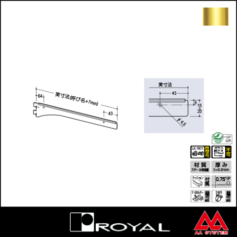 商品名 ロイヤル 水平ブラケット A-202 200 APゴールド塗装 品番 ROYAL-A-202-200G サイズ 呼び名 200 (※実寸法:呼び名+7mm) 対応棚 ガラス棚用 厚み t=3.0mm 角度 0.75°UP 材質 スチール特殊鋼 表面 ゴールド 付属品 この商品にはクッションが付属されております 納期 約1週間ほど納期が必要です 返品・交換 こちらの商品は返品・交換が不可となります 備考 ・LK(※別売)とRKY(※別売)の同時使用は出来ません。